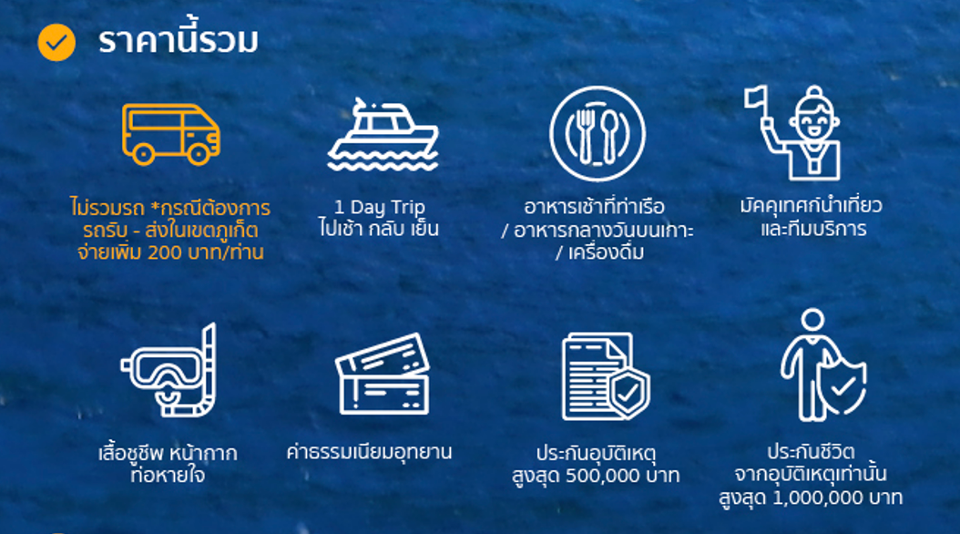 ราคานี้ไม่รวมรถรับ-ส่ง ท่าเรือ โดยจะมีค่าธรรมเนียม 200 บาทต่อท่าน สำหรับพื้นที่ในจังหวัดภูเก็ตเท่านั้น