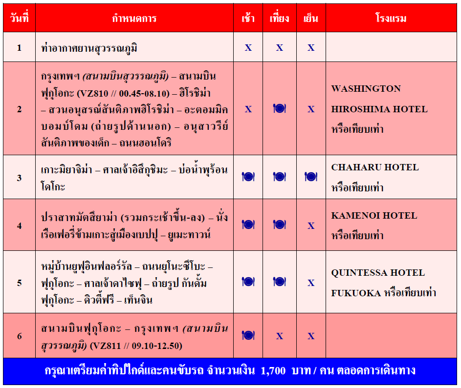 ค่าอาหารทุกมื้อตามรายการระบุ (สงวนสิทธิ์ในการสลับมื้อหรือเปลี่ยนแปลงเมนูอาหารตามสถานการณ์)